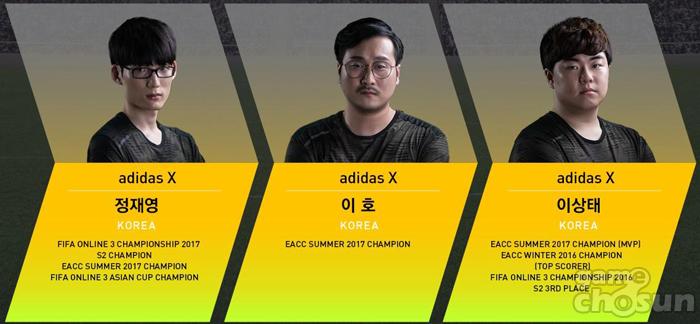 가장 유력한 우승 후보로 거론되고 있는 ‘Team Adidas X’는 작년 11월 25일 개최된 ‘피파온라인3 아디다스 챔피언십 2017 시즌2' 우승자 정재영을 비롯, ‘EACC Summer 2017’에서 우승을 차지한 이호, 이상태 등 멤버로 구성돼 있다. 이들은 중국 광저우 폴리 월드 트레이드 센터에서 진행된 ‘EACC Summer 2017’ 결승전에서 태국 대표팀 ‘티엔피’를 꺾고 상금 15만달러를 거머쥔 바 있다.