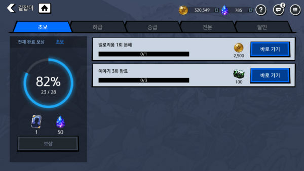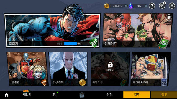 앞서 말한 것처럼 가장 기본이 되는 콘텐츠 '이야기'는 영웅 진영과 악당 진영의 스토리 진행도 알 수 있고, 이야기 진행 정도에 따라 다른 콘텐츠도 조금씩 해금된다. 가능하면 자신의 팀 전투력으로 갈 수 있는 최대치까지 진행하는 것이 좋다.
