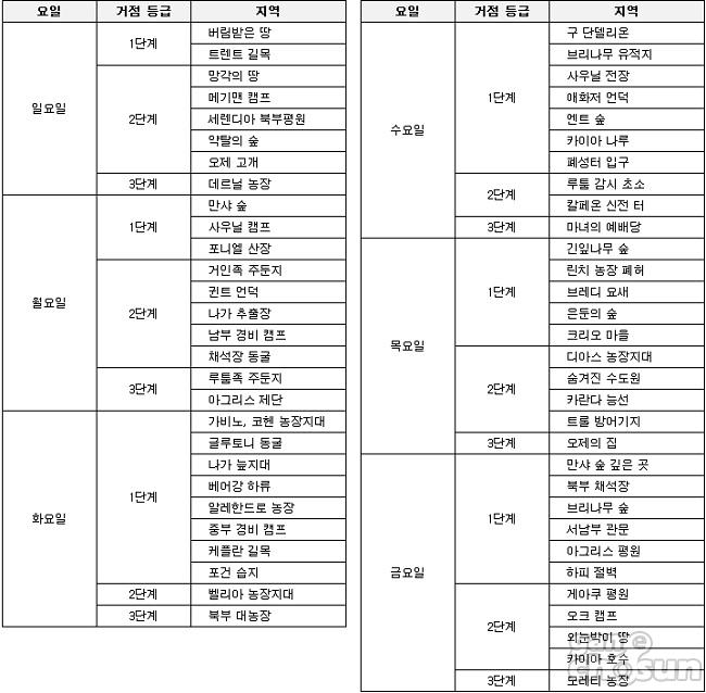 각 요일마다 거점전이 시작되는 지역이 다르며, 자세한 사항은 다음과 같다.