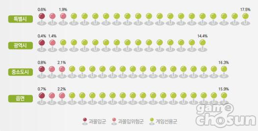 지역 규모별 비교에서는 중소도시의 ‘과몰입군’ 비율이 0.8%로 타 지역에 비해 가장 높게 나타났고, ‘과몰입위험군’ 비율은 읍면 2.2%, 중소도시 2.1%, 특별시 1.9%, 광역시 1.4% 순으로 조사됐다.