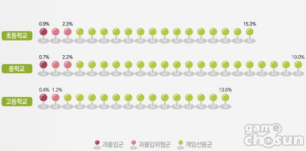 ‘과몰입위험군’의 비율 역시 초등학교 2.3%, 중학교 2.2%, 고등학교 1.2%로 나타나, 예년처럼 상급학교로 갈수록 ‘과몰입군’과 ‘과몰입위험군’비율이 낮아지는 경향을 보였다. 즉 청소년의 연령이 올라갈수록 게임과몰입에서 점차 벗어나고 있음을 확인할 수 있다.