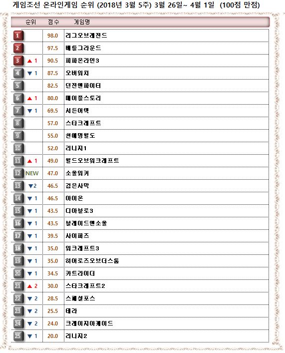 ▲2018년 3월 5주 온라인게임순위 (게임조선 제작)