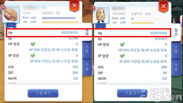 ▲ 비슷한 레벨에서 바이탈(VIT)을 전혀 투자하지 않은 나이트(좌측)와 크루세이더(우측) = 게임조선 촬영