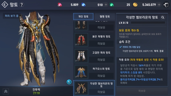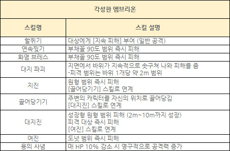 각성한 엠브리온의 망토는 착용 후 일반 공격 시 일정 확률로 주변에 바위를 떨어뜨리는 대지파괴 스킬을 자동으로 시전하며 이 바위에 피격된 대상은 물리, 마법 공격력에 기반한 피해를 입고 스턴 상태에 빠지는 효과를 가지고 있어 근접 캐릭터들의 사랑을 받을 것으로 보인다.