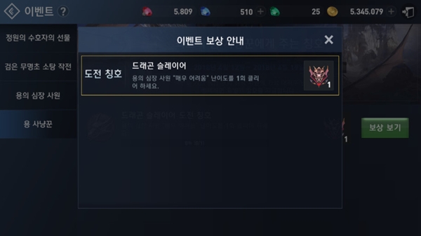 4월 19일 이전까지 매우 어려움 난이도 공략에 성공하면 드래곤 슬레이어 칭호를 획득할 수 있으며 5월 8일 이전까지 난이도와 관계 없이 용의 심장 사원 공략 횟수에 따라 용의 비늘을 추가 획득하거나 평범한 용 사냥꾼 칭호를 활성화할 수 있다.