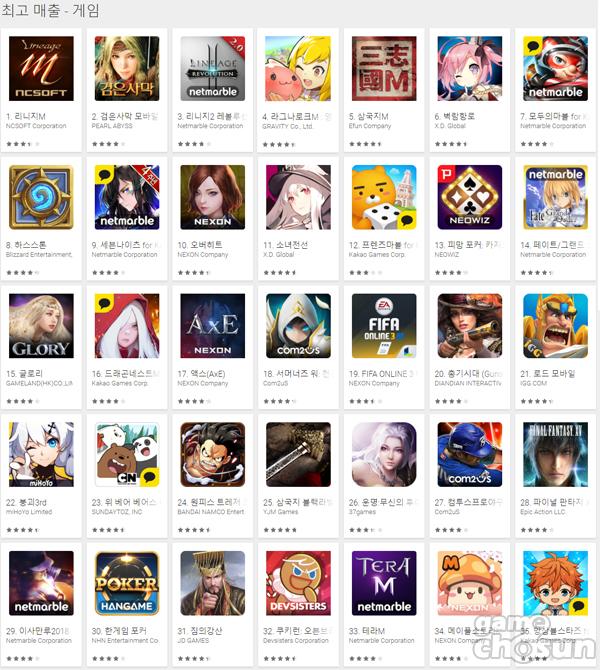 2018년 4월 16일 구글플레이 게임 부문 최고 매출 순위 갈무리