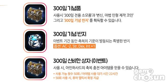 '300일 기념 반지'의 옵션도 공개됐다. 국민 반지, 기사단의 반지와 같은 'AC-2 에 각 클래스 주요 스탯 +1'로 이루어져 공격과 방어를 모두 만족시키도록 디자인됐다. 마찬가지로 해당 반지는 이벤트 종료 시점인 5월 2일 정기점검 전까지만 옵션이 활성화되고, 100일 기념 반지, 200일 기념 반지와 함께 추후 1주년 반지 제작 재료로 사용될 예정이다. 100일, 200일 기념 반지를 얻지 못한 이용자라면 이벤트 기간 동안 마일리지샵을 통해 싼 가격에 구매할 수 있다.