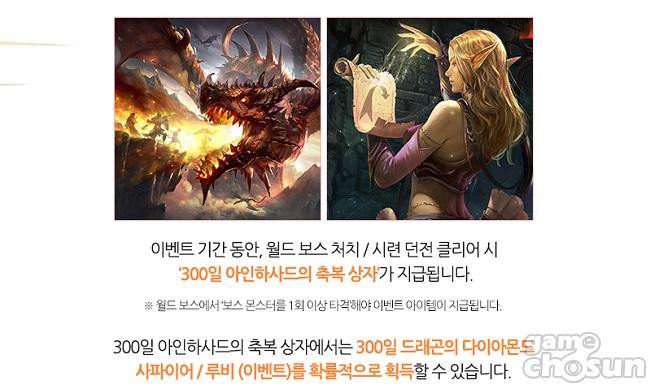 이벤트 기간 동안 월드 보스와 시련 던전에서 '300일 아인하사드의 축복 상자'를 추가로 획득할 수 있으며 이를 통해 드래곤의 다이아몬드, 사파이어, 루비 등을 확률적으로 획득할 수 있다. 이용자들이 가장 필요로 하는 것이 아인하사드의 축복인 만큼 이벤트 기간 동안 보다 풍족한 게임 플레이가 가능할 것으로 여겨지는 부분이다.