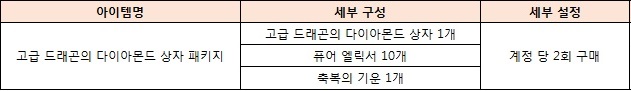 덧붙여 고급 드래곤의 다이아몬드 상자 리뉴얼 기념으로 상자 패키지가 추가, 1,500 다이아에 고급 드래곤의 다이아몬드 상자 외 '퓨어 엘릭서 10개'와 '축복의 기운 1개'를 추가로 얻을 수 있는 기회를 마련했다. 축복의 기운은 2개를 모아 축복받은, 저주받은 강화 주문서를 제작할 수 있는 제작 재료다.