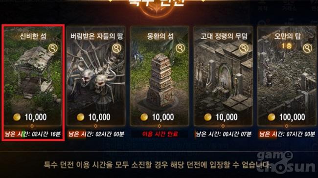 추가로, 입장은 던전 탭의 특수 던전에서 가능하며 비용은 1만 아데나다. 또, 일일 2시간 이용할 수 있으며 던전 내부는 텔레포트 기억 불가, 랜덤 텔레포트 가능 지역이다. 따라서 유저가 몰리지 않은 곳으로 랜덤 텔레포트해서 사냥이 가능하다.