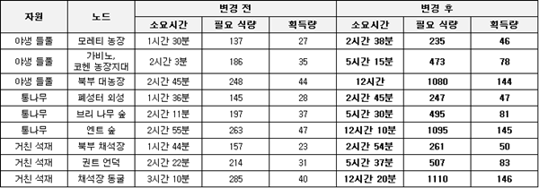 ▲ 소요 시간, 필요 식량이 늘어남에 따라 획득량도 늘어난다