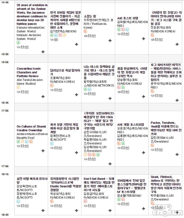 이어 메이플 스토리 로컬라이징과 시나리오 기획, 게임운영툴, FPS(1인칭슈팅) 레벨제작, ORM 구현, 유니티 프로젝트 네이트브 프로파일링, 게임 라이브 서비스 사례 공유, 웹 프로그래밍 등에 대한 강연이 이어진다.