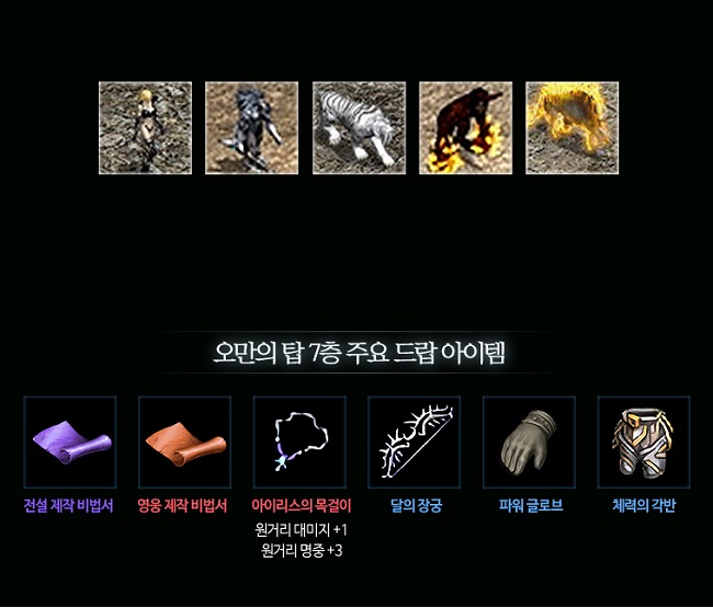 오만의 탑 7층에서 획득할 수 있는 주요 아이템으로는 전설 제작 비법서와 영웅 제작 비법서, 영웅 등급 장신구 아이리스의 목걸이, 달의 장궁, 파워 글로브, 체력의 각반 등이 있다. 특히 아이리스의 목걸이는 원거리 대미지 +1 / 원거리 명중 +3의 효과가 있어, 활을 주무기로 하는 요정에게 큰 인기를 끌 것으로 예상된다.