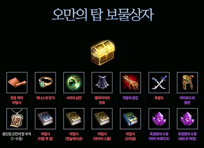일정 확률로 오만의 탑에서 확득 가능한 아이템이 등장하는 '오만의 탑 보물상자'도 선보일 예정이다. 오만의 탑 보물상자에서는 영웅 등급의 장비 격분의 장갑과 머미로드의 왕관, 아머 브레이크, 쉐도우 마킹 등을 획득할 수 있으며 이외에도 영웅 제작 비법서, 제니스의 반지, 시어의 심안, 뱀파이어의 망토, 흑왕도 등의 장비와 이뮨 투 함, 캔슬레이션, 파이어 스톰, 오라클 등의 기술 획득이 가능하다.