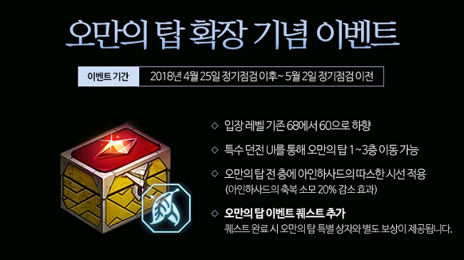 새로운 이벤트도 선보인다. 오만의 탑 확장 기념 이벤트를 통해 5월 2일까지 오만의 탑 입장 레벨이 68에서 60으로 하향 조정되며, 특수 던전 UI를 통해서 오만의 탑 1~3층을 빠르게 이동 가능하다. 뿐만 아니라 오만의 탑 전 층에 아인하사드의 축복 소모가 20% 감소하는 효과가 적용되며 이벤트 퀘스트를 통해 특별 보상도 마련된다.