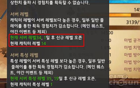 이제 30레벨이 되면 서버 레벨을 확인해야 한다. 이는 서버 레벨과 이용자 레벨 간의 격차가 크면 클수록 추가 경험치를 획득할 수 있기 때문이다. 만약 오픈한지 오래된 서버에서 게임을 플레이 한다면 일일 퀘스트를 완료하기만 해도 빠른 성장이 가능하다.