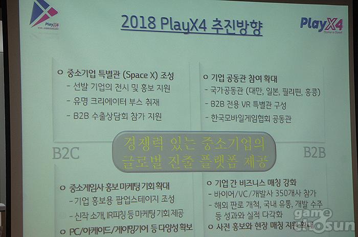 먼저 올해의 플레이엑스포의 B2C관에서는 중소 개발사들의 홍보 및 마케팅을 지원하기 위해 중소기업 특별관인 스페이스 X를 운영할 계획이다. 이를 통해 일반 관람객들에게 중소개발사의 게임들을 직접적으로 홍보할 수 있다.