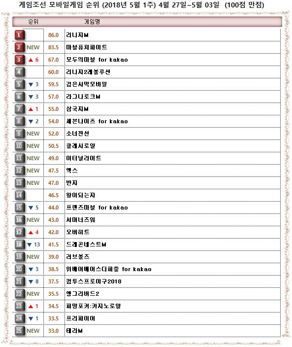2018년 5월 1주 <게임조선> 모바일게임순위