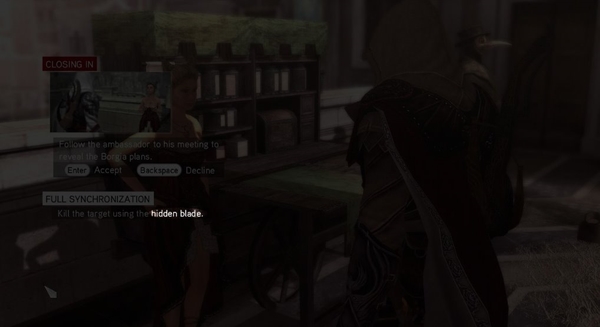 또 미션의 오역으로 '접근' 미션이 있다. 완전 동기화 조건으로는 신입을 이용해 대상을 암살하라고 안내하는데 실제로 이 게임은 신입 암살자를 소환하여 어그로를 끌거나 암살하는 게 가능하기 때문에 안내대로 신입을 불러와 암살하면 그대로 완전 동기화 미션은 실패로 돌아가는 것이다.