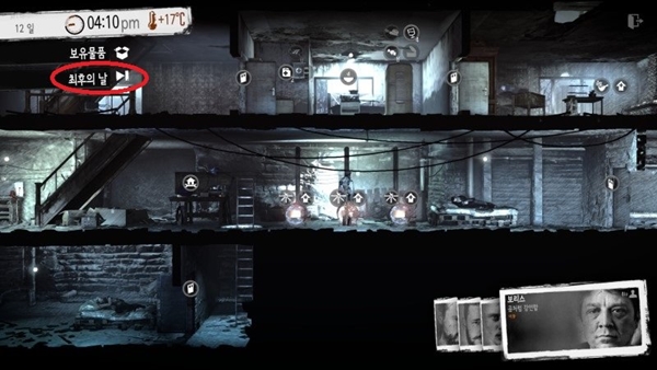 디스 워 오브 마인의 스팀 공식 한글화는 크고 작은 오역이 있지만 가장 치명적인 오역은 바로 게임의 주요 시스템 중 하나인 'End Day' 버튼이다.