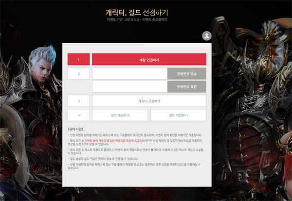 8일 14시부터 게임 공식 홈페이지에서 게임 캐릭터와 길드를 미리 생성할 수 있으며 참가자 전원에게는 게임 정식 론칭 후 사용할 수 있는 웰컴 패키지를 제공받는다. 이 패키지에는 축복받은 증폭 마법석 2000개, 투혼의 물약 20개, 일격의 물약 20개 등이 포함됐다.