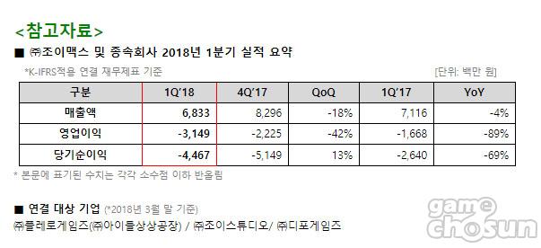 조이맥스(대표 이길형)는 국제회계기준 적용 연결 재무제표 기준 2018년 1분기 매출액 약 68억원, 영업손실 약 31억원으로 집계됐다고 9일 전했다.