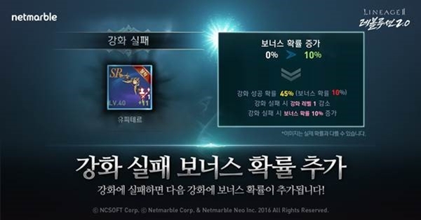 우선 장비 강화에 대한 부담을 줄이기 위해 보너스 성공 확률 시스템이 추가된다. 해당 시스템은 특성 강화나 펫 장비 강화처럼 장비 강화 실패 시 추가 성공 확률이 누적되며 이는 강화에 성공할 때까지 계속 유지된다는 특징을 가지고 있다.