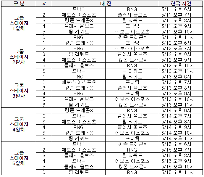 개막전으로는 유럽 홈 팬들의 성원를 받는 프나틱과 수많은 중국 팬들의 기대를 받고 있는 RNG 간 대결이 예정돼 있다. ‘LoL 챔피언스 코리아’ 스프링 스플릿 우승팀 자격으로 한국 지역을 대표해 출전한 킹존 드래곤X는 11일 오후 8시 북미 팀 리퀴드를 상대로 첫 경기를 펼친다.