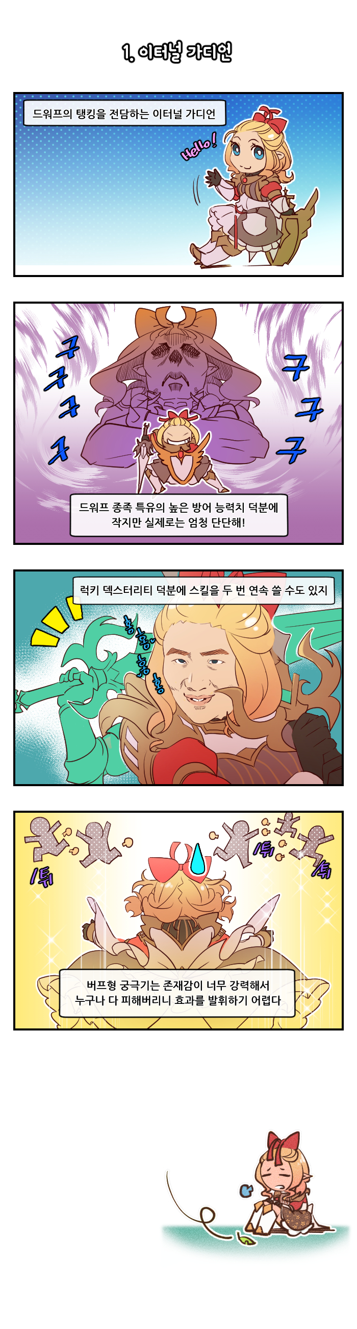 해당 작품은 2차 전직의 장점과 단점 그리고 활용법을 재치발랄하게 표현한 것이 특징이다. 드워프편에서 소개할 직업은 이터널 가디언(가디안), 워스미스(워 레인저), 엘드리치 위저드(쿼럴 위저드)이다.
