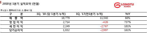 룽투코리아(대표 양성휘)가 2018년 1분기 결산 결과 연결기준 매출액 188억원, 영업이익 27억원, 당기순이익 18억원을 기록했다고 15일 발표했다.