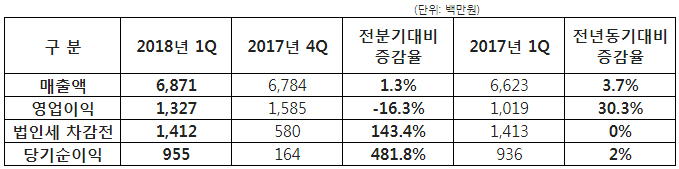 매출은 전년동기대비 3.7%, 전분기대비 1.3% 상승했고, 당기순이익도 전년동기대비 2%, 전분기대비 481.8% 모두 상승했다. 영업이익은 전년동기대비 30% 늘었고 전분기대비 -16.3% 감소했다.