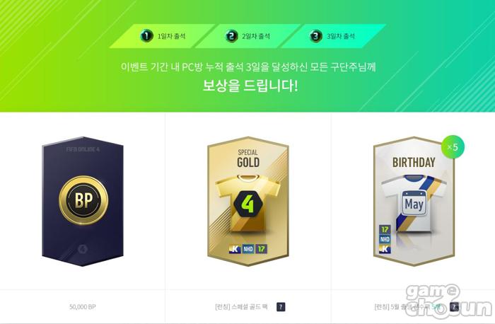 1일 PC방 누적 접속 시간 30분마다 또 다른 보상을 획득할 수 있다. 최대 120분까지 30분마다 보상이 주어지며 14종의 보상 중 1종이 무작위로 지급된다. 이 밖에도 누적 접속 시간이 5시간이되면 ‘NHD ALL선수팩’, 10시간이 되면 ‘[런칭] 스페셜 골드 팩’을 획득할 수 있다.