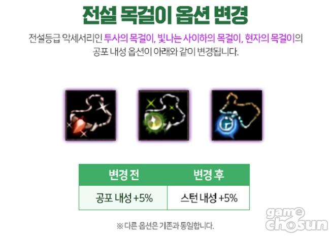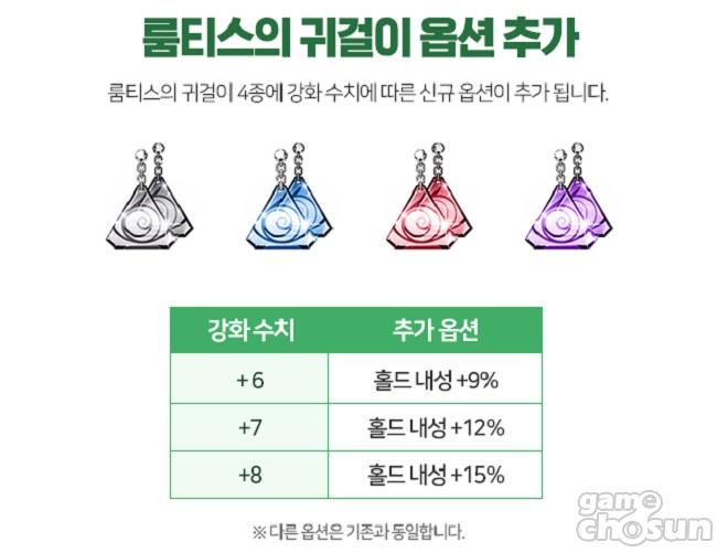 이밖에도 공포 내성 옵션으로 아쉬움이 많았던 전설 목걸이 '투사의 목걸이', '현자의 목걸이', '빛나는 사이하의 목걸이'가 스턴 내성 +5% 옵션으로 변경되어 전설 등급 목걸이로써의 위용을 과시하게 됐고, +6 강화 이상 룸티스의 귀걸이에도 강화 단계에 따라 '홀드 내성 +9% ~ 15%' 옵션이 추가됐다.