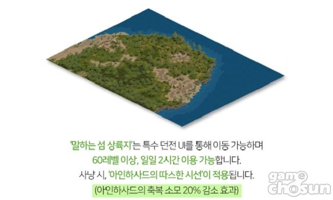 기존의 '~섬' 던전들과 마찬가지로 60레벨 이상 입장 가능, SafetyZone, 장소 기억 불가, 랜덤 텔레포트 가능, 아인하사드의 축복 감소율 20% 보너스 적용, 일일 2시간 이용이 가능하다. 말하는 섬 몬스터가 그대로 등장하지만 레벨과 난이도, 경험치 보상은 상향 조정됐다.