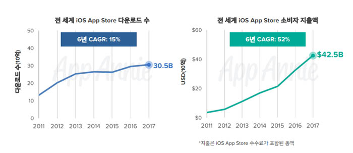 2015년과 2017년을 비교하면 애플 앱스토어의 수익 성장률(52%)이 다운로드 증가세(15%)를 넘어섰다.
