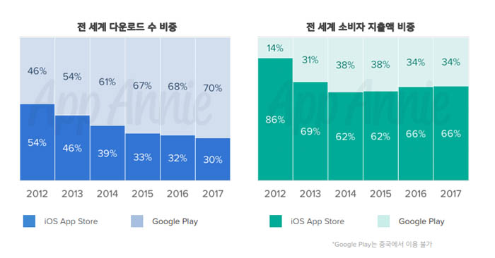전 세계 구글플레이와 애플앱스토어 다운로드/매출 비중 = 앱애니 제공
