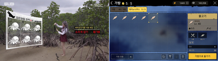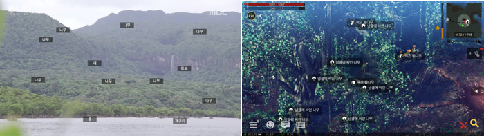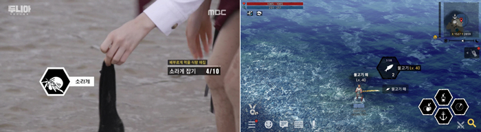 또한, 출연진들이 생존하기 위해 열매를 채집하고, 물을 뜨고, 갯벌에서 소라게를 잡는 등의 장면은 ‘야생의땅: 듀랑고’ 내 임무 수행 과정을 연상케 하며, 임무를 완료한 뒤 중간 중간 흘러나오는 효과음은 게임 내 BGM을 그대로 녹여내 친근감을 더했다.