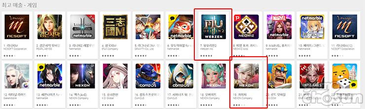 한편 뮤오리진2은 4일 정식 서비스를 시작해 5일 구글 매출 14위로 출발해 6일 7위에 올랐고 같은 날 사전 오픈을 한 카이저는 구글 매출 33위에서 6일 19위에 올랐다.