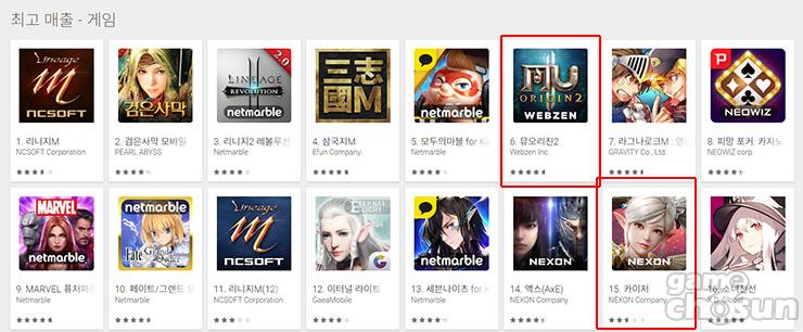 6일 오후 구글플레이 게임 부문 최고매출 순위에 따르면 뮤오리진2는 6위, 카이저는 15위에 올랐다.