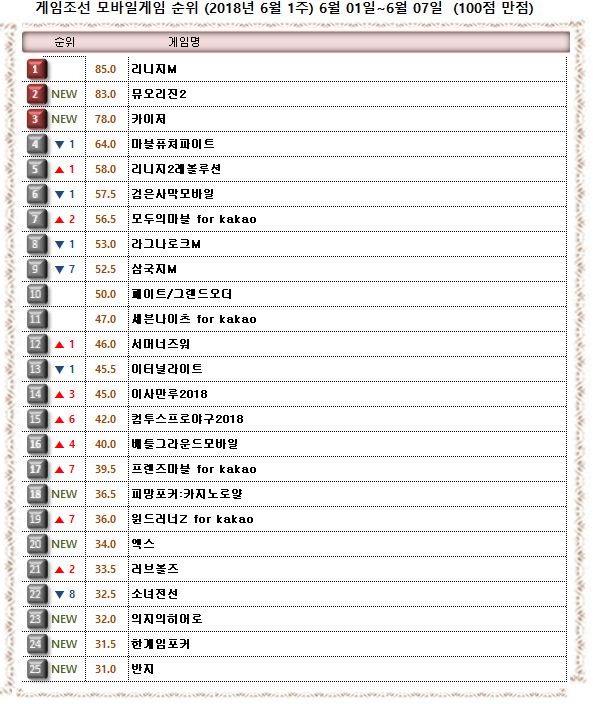 2018년 6월 1주 <게임조선> 모바일게임순위