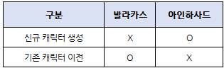 반면 아인하사드 서버는 기존 캐릭터의 이전이 제한되는 대신 신규 캐릭터 생성만이 가능하며 추후 서버 규모에 따라 신규 캐릭터의 생성이 가능하도록 변경될 수 있는 발라카스와 달리 캐릭터 이전 서비스가 앞으로도 제공되지 않아 완전히 새로운 환경에서 게임을 시작해야 한다.