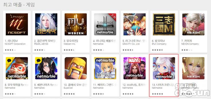 한편 넷마블은 신작 나이츠크로니클를 포함해 구글 매출 탑15 안에 리니지2 레볼루션, 모두의마블, 세븐나이츠, 페이트/그랜드오더, 마블퓨처파이트 등 총 6종 게임을 안착시키며 신·구작의 조화를 보이고 있다.