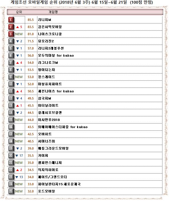 2018년 6월 3주 <게임조선> 모바일게임순위