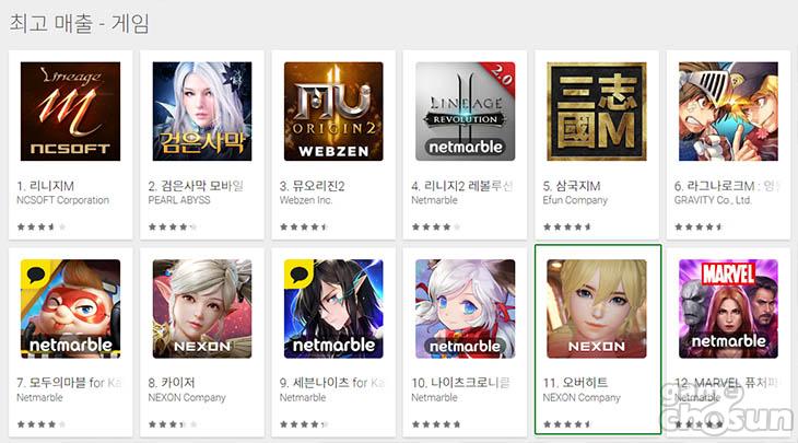 오버히트가 2018년 6월 23일 오전 구글플레이 게임 부문 최고매출 순위에서 11위에 올랐다