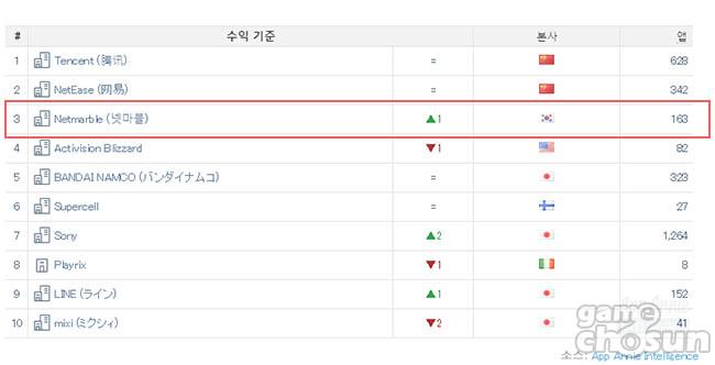 이는 텐센트(중국)과 넷이즈(중국)에 이어 세 번째를 기록한 것으로 전달 대비 1계단 상승했고 10위 안에 유일한 국내 기업이다.