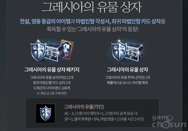 신규 판매 상품으로는 '그레시아의 유물 상자'가 추가됐다. 그레시아의 유물 상자에서는 그레시아의 유물 또는 고급 유물을 획득할 수 있다.