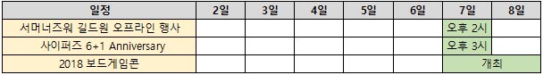 특히, 여름 방학이 본격적으로 시작되는 이번 주는 주말에는 '서머너즈워' '사이퍼즈' 오프라인 행사가 진행될 예정이다. 아울러 국내외 500여종 보드 게임의 전시 및 체험이 이뤄지는 '2018 보드게임콘'이 7일, 8일 양일간 코엑스에서 열린다.