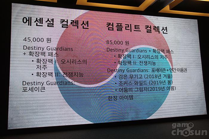 ‘데스티니가디언즈’는 게임 본편 및 확장패스, 확장팩인 포세이큰을 포함한 에센셜 컬렉션과 에센셜 컬렉션에 연간 이용권 및 한정 아이템을 포함한 컴플리트 컬렉션 2종으로 디지털 판매된다. 특히 연간 이용권은 향후 업데이트될 검은 무기고, 조커스 와일드, 어둠의 그림자 콘텐츠를 포함한다.