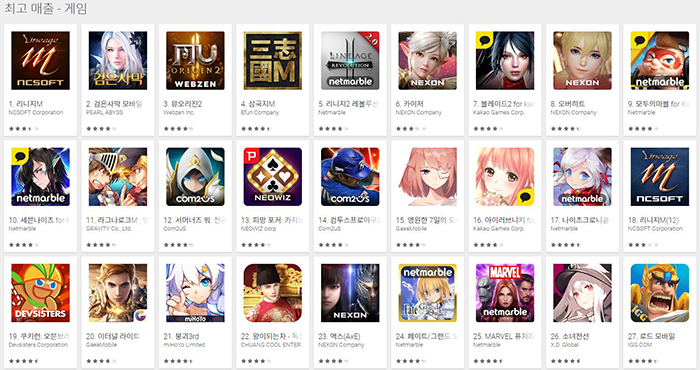 2018년 7월 2일 구글플레이 게임 부문 최고 매출 순위 갈무리