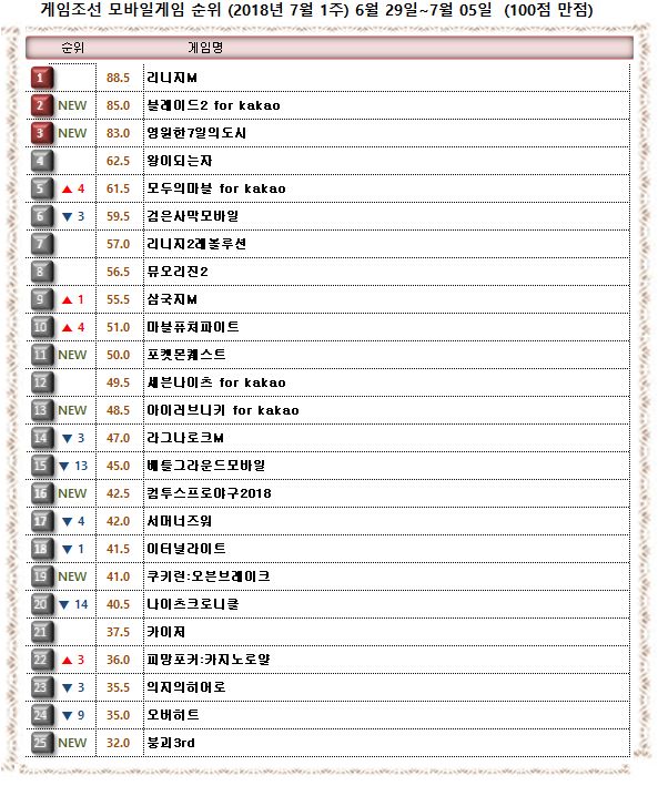2018년 7월 1주 <게임조선> 모바일게임순위